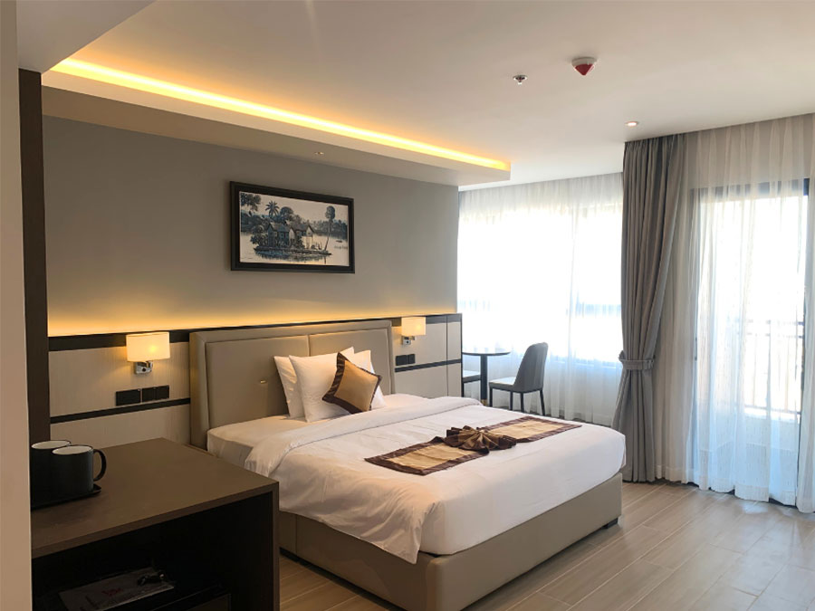Settle down for a great night sleep on our new, very comfortable beds fitted with high quality cotton sheets and pillows. Relax in a beautifully tranquil environment with subtle, ambient lighting, flat-screen satellite TV and tea and coffee making facilities. The furniture shows off the Cambodian craftsmanship, as does the traditional artwork on display. All rooms are connected to the hotel fire system via smoke detectors.